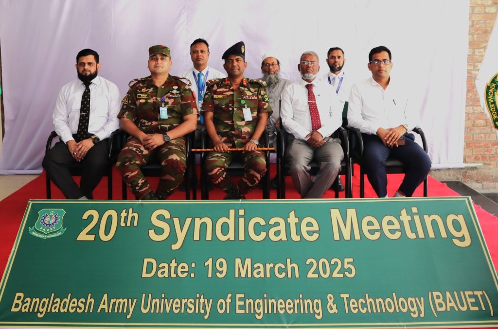 বাউয়েট, কাদিরাবাদ, নাটোরঃ বাংলাদেশ আর্মি ইউনিভার্সিটি অব ইঞ্জিনিয়ারিং এন্ড টেকনোলজি (বাউয়েট) এর ২০তম সিন্ডিকেট সভা গত বুধবার (১৯ মার্চ ২০২৫) সকাল ১১টায় লগইনের মাননীয় উপাচার্য ব্রিগেডিয়ার জেনারেল মোঃ মিজানুজ্জামান এর সভাপতিত্বে সিন্ডিকেট কক্ষে অনুষ্ঠিত হয়।