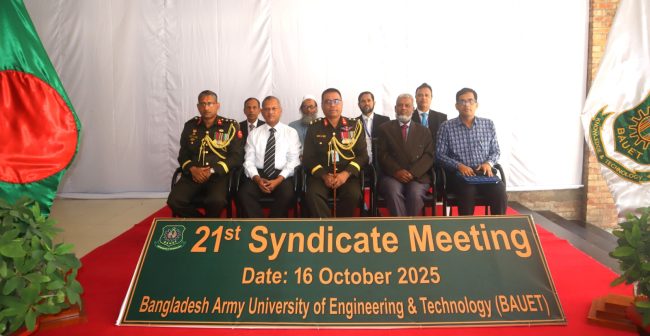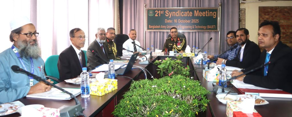 বাংলাদেশ আর্মি ইউনিভার্সিটি অব ইঞ্জিনিয়ারিং এন্ড টেকনোলজি (বাউয়েট) এর ২১তম সিন্ডিকেট সভা গত বৃহস্পতিবার ১৬ অক্টোবর ২০২৫ তারিখে লগইনের মাননীয় উপাচার্য ব্রিগেডিয়ার জেনারেল এস এম লুৎফর রহমান এর সভাপতিত্বে সিন্ডিকেট কক্ষে অনুষ্ঠিত হয়।