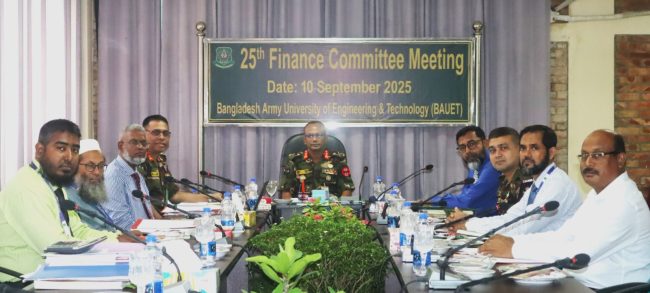 বাংলাদেশ আর্মি ইউনিভার্সিটি অব ইঞ্জিনিয়ারিং এন্ড টেকনোলজি (বাউয়েট) এর ২৫তম অর্থ কমিটির সভা গত বুধবার (১০ সেপ্টেম্বর ২০২৫ তারিখ) সিন্ডিকেট রুমে মেজর জেনারেল তৌহিদুল আহমেদ, এনডিসি, এএফডব্লিউসি, পিএসসি, জিওসি ১১ পদাতিক ডিভিশন ও এরিয়া কমান্ডার, বগুড়া এরিয়া মহোদয়ের সভাপতিত্বে অনুষ্ঠিত হয়।