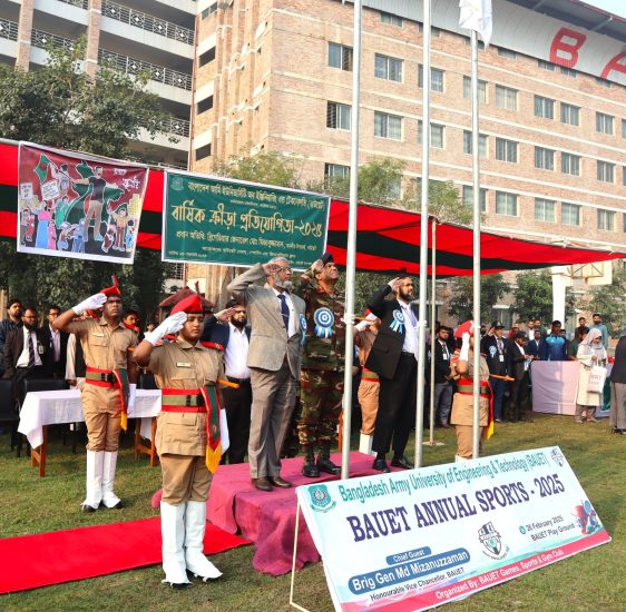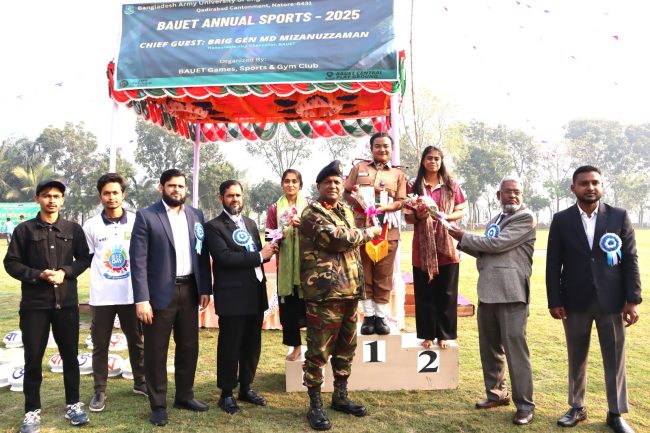 কাদিরাবাদ সেনানিবাস, নাটোরঃ বাংলাদেশ আর্মি ইউনিভার্সিটি অব ইঞ্জিনিয়ারিং এন্ড টেকনোলজি (বাউয়েট) ক্যাম্পাসের কেন্দ্রীয় খেলার মাঠে বিকেলে ‘বাউয়েট বার্ষিক ক্রীড়া প্রতিযোগিতা ও পুরস্কার বিতরণী অনুষ্ঠান ২০২৫’ অনুষ্ঠিত হয়। গত বুধবার (২৬ ফেব্রুয়ারি) আয়োজিত অনুষ্ঠানে মাননীয় উপাচার্য ব্রিগেডিয়ার জেনারেল মোঃ মিজানুজ্জামান প্রধান অতিথি হিসেবে উপস্থিত ছিলেন।