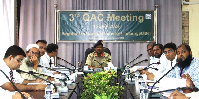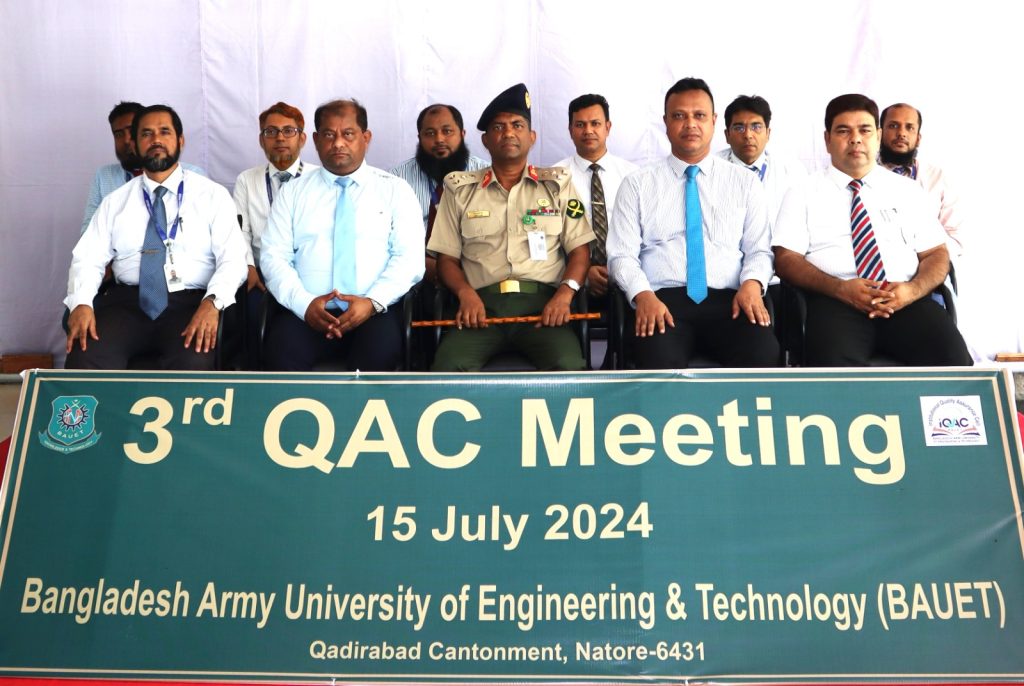 বাউয়েট, কাদিরাবাদ, নাটোরঃ বাংলাদেশ আর্মি ইউনিভার্সিটি অব ইঞ্জিনিয়ারিং এন্ড টেকনোলজি (বাউয়েট) এর আইকিউএসি দপ্তরের উদ্যোগে সিন্ডিকেট রুমে সকাল ১০টায় কোয়ালিটি অ্যাসিউরেন্স কমিটির তৃতীয় সভা অনুষ্ঠিত হয়েছে। গত সোমবার (১৫ জুলাই ২০২৪) তারিখে আয়োজিত অনুষ্ঠানের সভাপতিত্ব করেন বাউয়েট এর মাননীয় উপাচার্য ও কিউএসি-এর সভাপতি ব্রিগেডিয়ার জেনারেল মোঃ মিজানুজ্জামান।