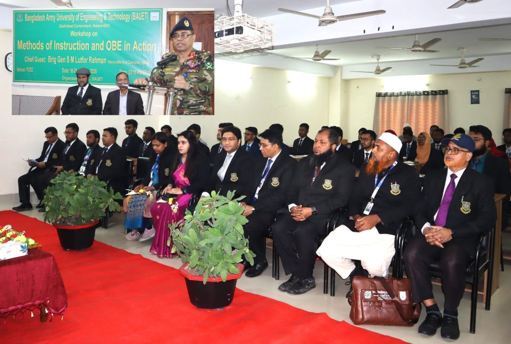 বাউয়েট, কাদিরাবাদ নাটোরঃ বাংলাদেশ আর্মি ইউনিভার্সিটি অব ইঞ্জিনিয়ারিং এন্ড টেকনোলজি (বাউয়েট) ক্যাম্পাসে আইকিউএসি, বাউয়েট-এর উদ্যোগে চার দিনব্যাপী “ম্যাথডস অব ইন্সট্রাকশন এন্ড ওবিই ইন অ্যাকশন” শীর্ষক শিক্ষক প্রশিক্ষণ কর্মশালার উদ্বোধন করা হয়েছে। অনুষ্ঠানের প্রধান অতিথি ও লগইনের উপাচার্য ব্রিগেডিয়ার জেনারেল এস এম লুৎফর রহমান গত ১৮ জানুয়ারি (রবিবার) কর্মশালাটি উদ্বোধন করেন ।