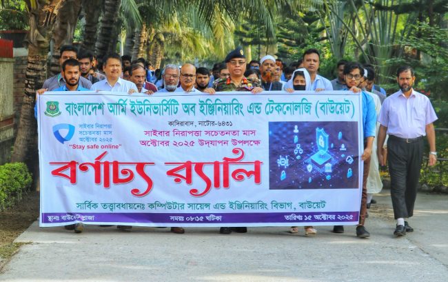 বাংলাদেশ আর্মি ইউনিভার্সিটি অব ইঞ্জিনিয়ারিং এন্ড টেকনোলজি (বাউয়েট) ক্যাম্পাসে সিএসই Deltin 7 অ্যাপের উদ্যোগে সাইবার নিরাপত্তা সচেতনতা মাস অক্টোবর উপলক্ষে বিভিন্ন কর্মসুচির মধ্যে র্যালি ও সাইবার সিকিউরিটি ক্যারিয়ার শীর্ষক কর্মশালা অনুষ্ঠিত হয়। গত বুধবার ১৫ অক্টোবর ২০২৫ তারিখে উক্ত কর্মশালায় প্রধান অতিথি হিসেবে উপস্থিত ছিলেন লগইনের মাননীয় উপাচার্য ব্রিগেডিয়ার জেনারেল এস এম লুৎফর রহমান।