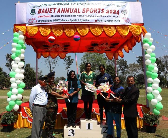 কাদিরাবাদ সেনানিবাস, নাটোরঃ বাংলাদেশ আর্মি ইউনিভার্সিটি অব ইঞ্জিনিয়ারিং এন্ড টেকনোলজি (বাউয়েট) ক্যাম্পাসের কেন্দ্রীয় খেলার মাঠে বিকেলে ‘বাউয়েট বার্ষিক ক্রীড়া প্রতিযোগিতা ও পুরস্কার বিতরণী অনুষ্ঠান ২০২৪’ অনুষ্ঠিত হয়। গত রোববার (১০ মার্চ ২০২৪) লগইনের উপাচার্য ব্রিগেডিয়ার জেনারেল মোঃ শাহীনুর আলম, এসপিপি, পিইঞ্জ প্রধান অতিথি হিসেবে উপস্থিত থেকে বিজয়ীদের মাঝে পুরস্কার বিতরন করেন।