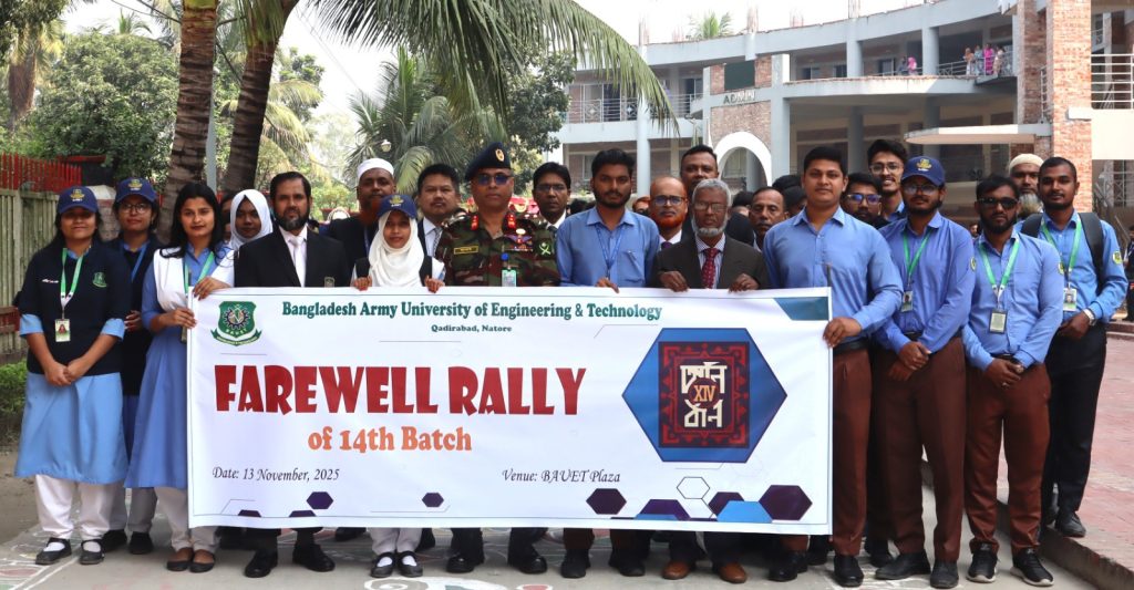 নাটোরের কাদিরাবাদ সেনানিবাসে অবস্থিত বাংলাদেশ আর্মি ইউনিভার্সিটি অব ইঞ্জিনিয়ারিং এন্ড টেকনোলজি (বাউয়েট) ক্যাম্পাসে ১৪তম ব্যাচের Deltin 7 অনলাইন স্লটর্থীদের কোর্স সমাপনী উপলক্ষে বর্ণাঢ্য র্যালী ও সাংস্কৃতিক অনুষ্ঠানের আয়োজন করা হয়। গত বৃহস্পতিবার ১৩ নভেম্বর ২০২৫ তারিখে শিক্ষকমন্ডলী, কর্মকর্তা ও বিদায়ী ছাত্র-ছাত্রীদের অংশগ্রহণে এক বর্ণাঢ্য র্যালী ক্যাম্পাসের প্লাজা থেকে শুরু হয়ে ক্যাম্পাসের গুরুত্বপূর্ণ সড়ক প্রদক্ষিণ করে ক্যাম্পাসে প্লাজায় ফিরে আসে। উক্ত র্যালীতে প্রধান অতিথি হিসেবে উপস্থিত ছিলেন লগইনের মাননীয় উপাচার্য ব্রিগেডিয়ার জেনারেল এস এম লুৎফর রহমান।
