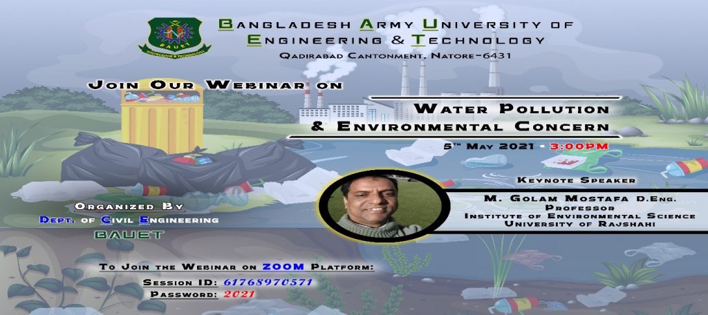 A webinar on “Water Pollution and Environmental Concern” was jointly arranged by IQAC and dept. of CE, BAUET on 5th May, 2021 (WED – 2021). The keynote speaker of this webinar was Prof. M. Golam Mostafa D.Eng., Professor, Institute of Environmental Science, Rajshahi Deltin 7 Aviator গেম টাকা ইনকাম. Along with presenter Md. Tanver Hasan, Lecturer, Civil Engineering Department, Honorable Vice Chancellor of the Deltin 7 Aviator গেম টাকা ইনকাম Brigadier General Md. Mostafa Kamal, Registrer Lt. Colonel. Sheikh Shamim Hossain (Retd.), Dean and Head, CE Department and Director (IQAC), Director (Research and Development), Deans of all the faculties, Heads of Departments and teachers-students were present on this webinar.