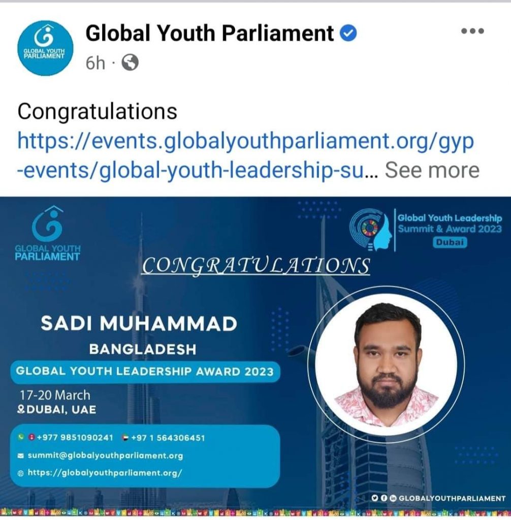 Sadi Muhammad Tamim, a student of CE, BAUET, is selected for Global Youth Leadership Award 2023. Every year this award is given to youth among 81 countries across the world.