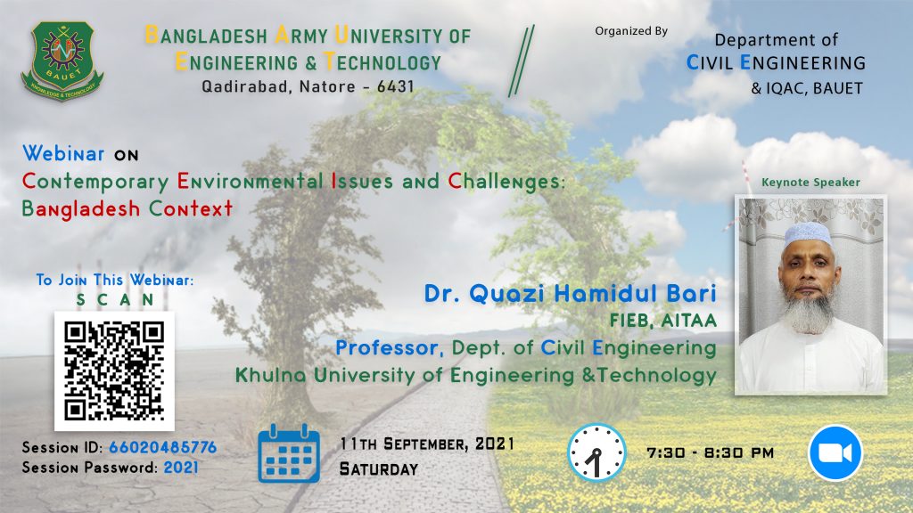 A webinar on “Contemporary Environmental Issues and Challenges: Bangladesh Context” was jointly arranged by IQAC and Dept. of CE, BAUET on 11th September 2021. The keynote speaker of this webinar was Prof. Dr. Quazi Hamidul Bari, FIEB, AITAA, Professor, Dept. of Civil Engineering, KUET, Khulna. Along with presenter Dr. Engr. Md. Mahmudur Rahman, Assistant Professor, Civil Department, Honorable Vice-Chancellor of the Deltin 7 Aviator গেম টাকা ইনকাম Brigadier General Md. Mostafa Kamal, Dean, Faculty of CEE, Head, Department of CE and Director (IQAC), Director (Research and Development) Prof. Dr. Engr. Md. Rashidul Hasan, Deans of all the faculties, Heads of Departments and teachers-students were present on this webinar.