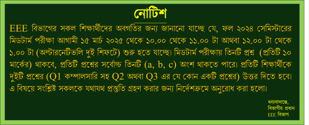 Notice for Thesis-II and IDP-II Defense Sessional Examination Routine for Summer-2025 Notice of Board Viva for Summer- 2025 Notice for Thesis-I and IDP-I Proposal Submission Mid-Term Examination Routine for Summer 2025 Semester Notice for Thesis-I Supervisor Allocation (EEE 15th Batch) Notice for IDP-I Supervisor Allocation (EEE 17th Batch) Notice for Submission of Thesis-II/IDP-II Draft Reports and Plagiarism Reports Thesis Supervisor Allocation 13th Batch (Revised) Notice for IDP and Thesis Defense Training for Laboratory staff of EEE Department Sessional Examination Routine for Fall-2024 Notice of Board Viva for Fall-24 Mid-Term Exam Routine (Fall-2024) Mid-Term Exam (Fall 2024) Notice for IDP-I Supervisor Allocation (EEE 16th Batch) Notice for Thesis/Project Supervisor Allocation EEE 14th Batch Thesis Supervisor Allocation EEE 13th Batch Industrial Attachment Report Submission & Presentation Notice for Thesis and IDP Defense of EEE 11th 12th 13th and 14th Batch Exam routine Fall 2023