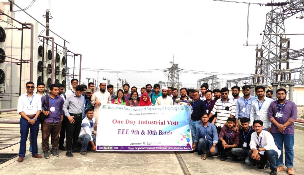 A one day industrial visit at “Bangladesh India Power Transmission Centre, HVDC, Bheramara, Kushtia” has been completed successfully on 02 April, 2022. Around 49 students from EEE 9 and EEE 10 batch along with teachers went to the visit the substation. It was organized by Department of EEE, BAUET.