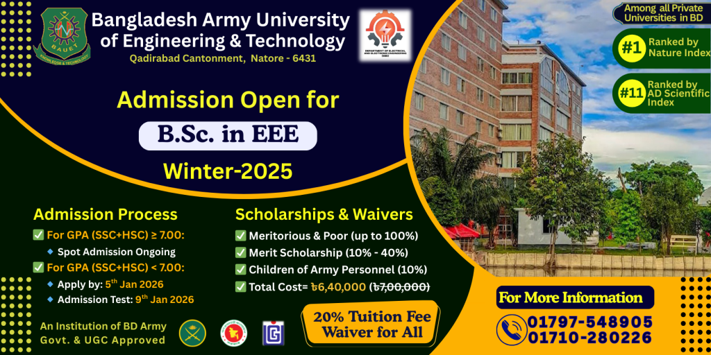 NB: Applicants who have obtained a total GPA of 7.00 together in HSC/Alim or equivalent and SSC/Dakhil & Diploma holders (SSC/Dakhil GPA 4.00 in Science Group & Diploma in Engineering CGPA 3.00) are eligible for direct admission through viva-voce immediately after the circular with the following documents: SSC & HSC Original Mark sheets, Certificates, NID/Birth Certificate, 06 Copies PP size photo, Parents’ NID photocopies.