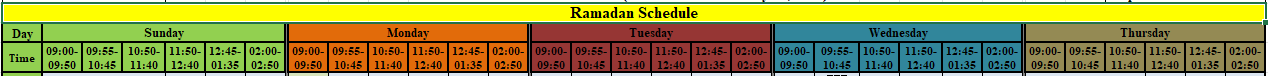 | Time | 08.15-09.10 | 09.15-10.10 | 10.10-11.10 | 11.40-12.35 | 12.40-01.35 | 02.00-02.55 |