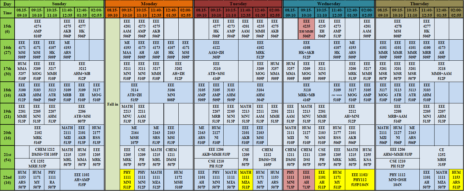 CE-609(30) ME-610(30) | CSE-413(30) CE-313(30) | CSE-413(30) CE-609(30) DBA-611(25) | CSE-413(30) CE-609(30) DBA-611(25) | EEE-506 (20) EEE-507 (60) EEE-513(30) |