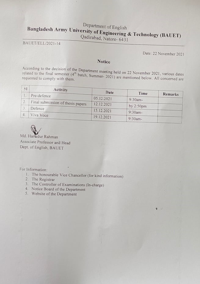 Thesis Defence and Viva Voce Dates of MA 2nd Batch and BA (Honours) 8th Batch