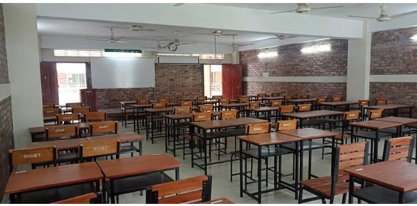 There is an adequate number of classrooms which are well decorated and equipped with modern technologies such as smart boards, multimedia projectors, audio-visual system,s, and internet facilities. The classroom size is large enough to accommodate 40 to 60 students. The department of ICE has a total number of 8 classrooms available for undergraduate students. All the classrooms are decorated with adequate numbers of furniture, electrical items, and teaching aid facilities i.e., chair, tables, display board, dais, light, fan, projector, and screen, etc. All classrooms have enough doors and windows to pass the air as well as having an emergency exit. In case of any emergency, a fire extinguisher can be used located in front of each classroom. All the classrooms have the same layout. Necessary data and the classroom layout are given below: