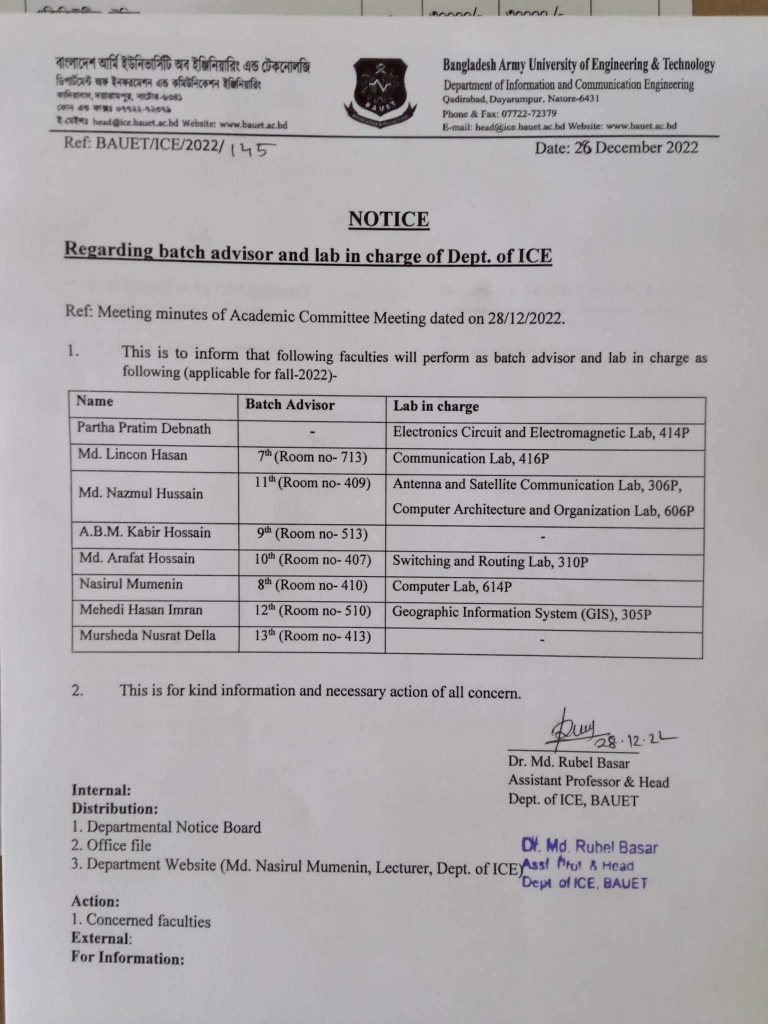 Regarding Batch Advisor and Lab in Charge of Dept. of ICE