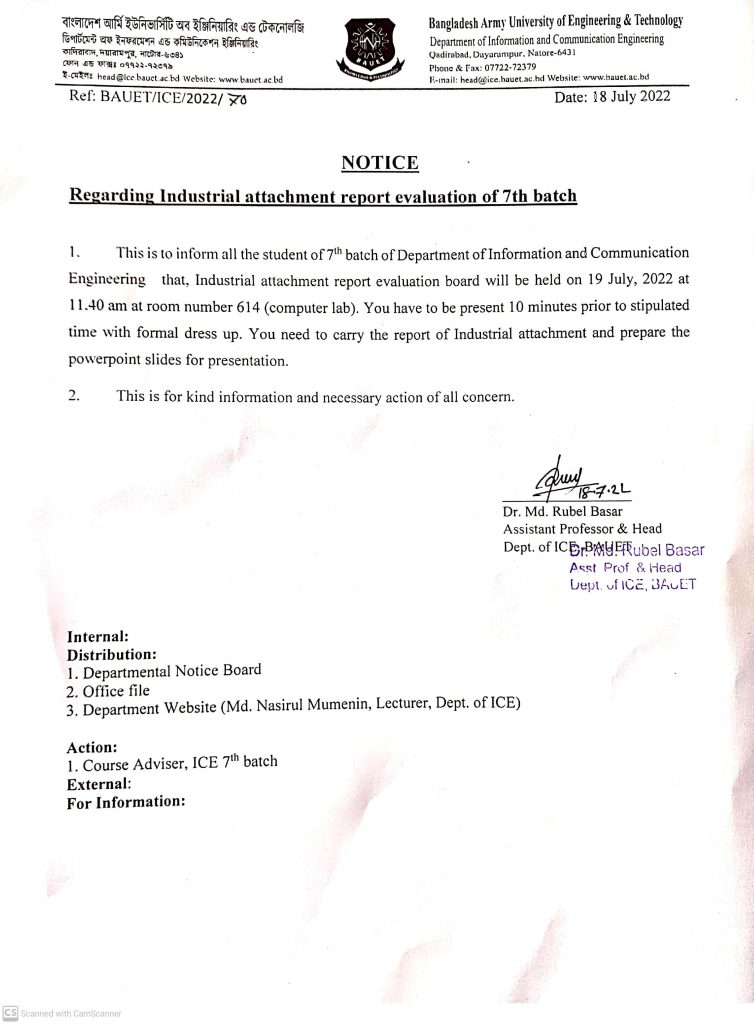 Regarding Industrial Attachment Report Evaluation of 7th Batch