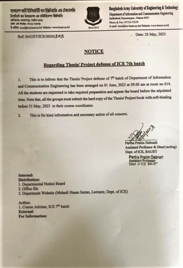 Regarding Thesis Defence Notice ICE 7th Batch