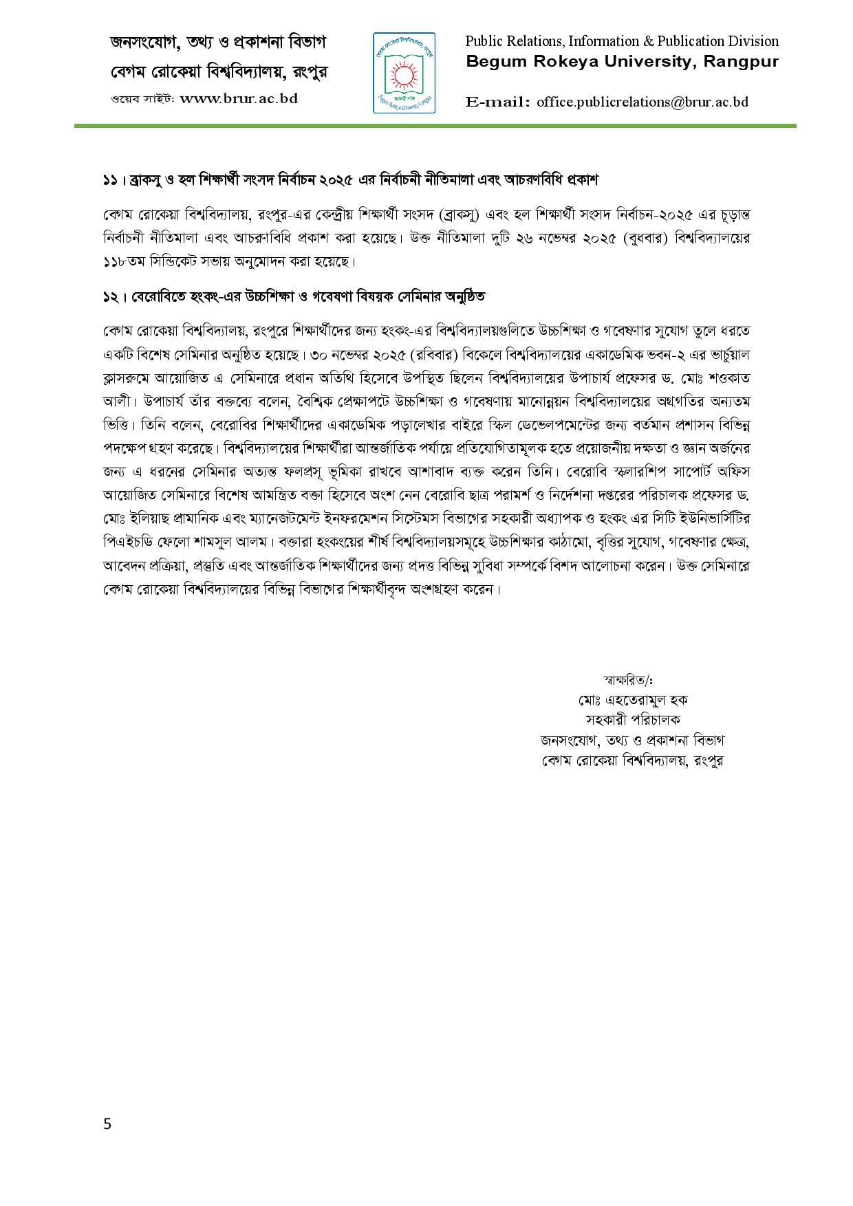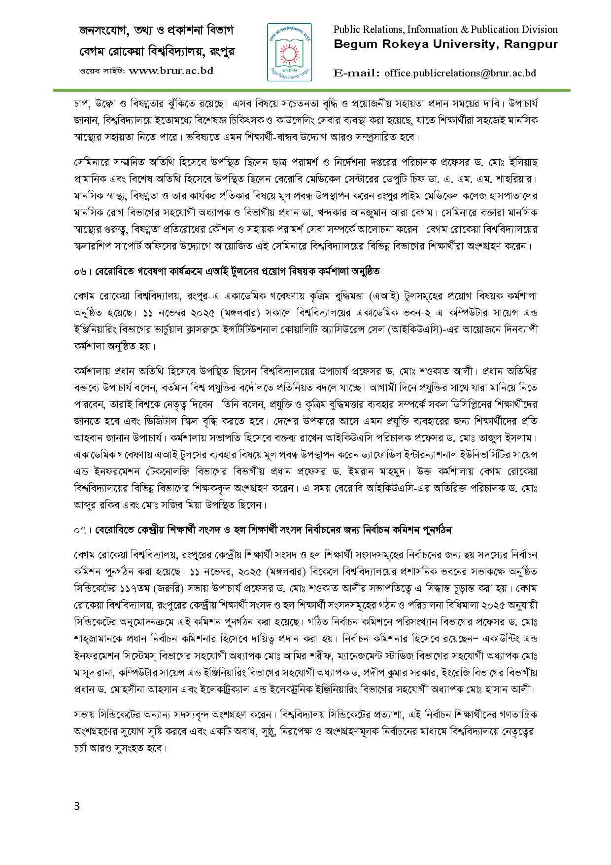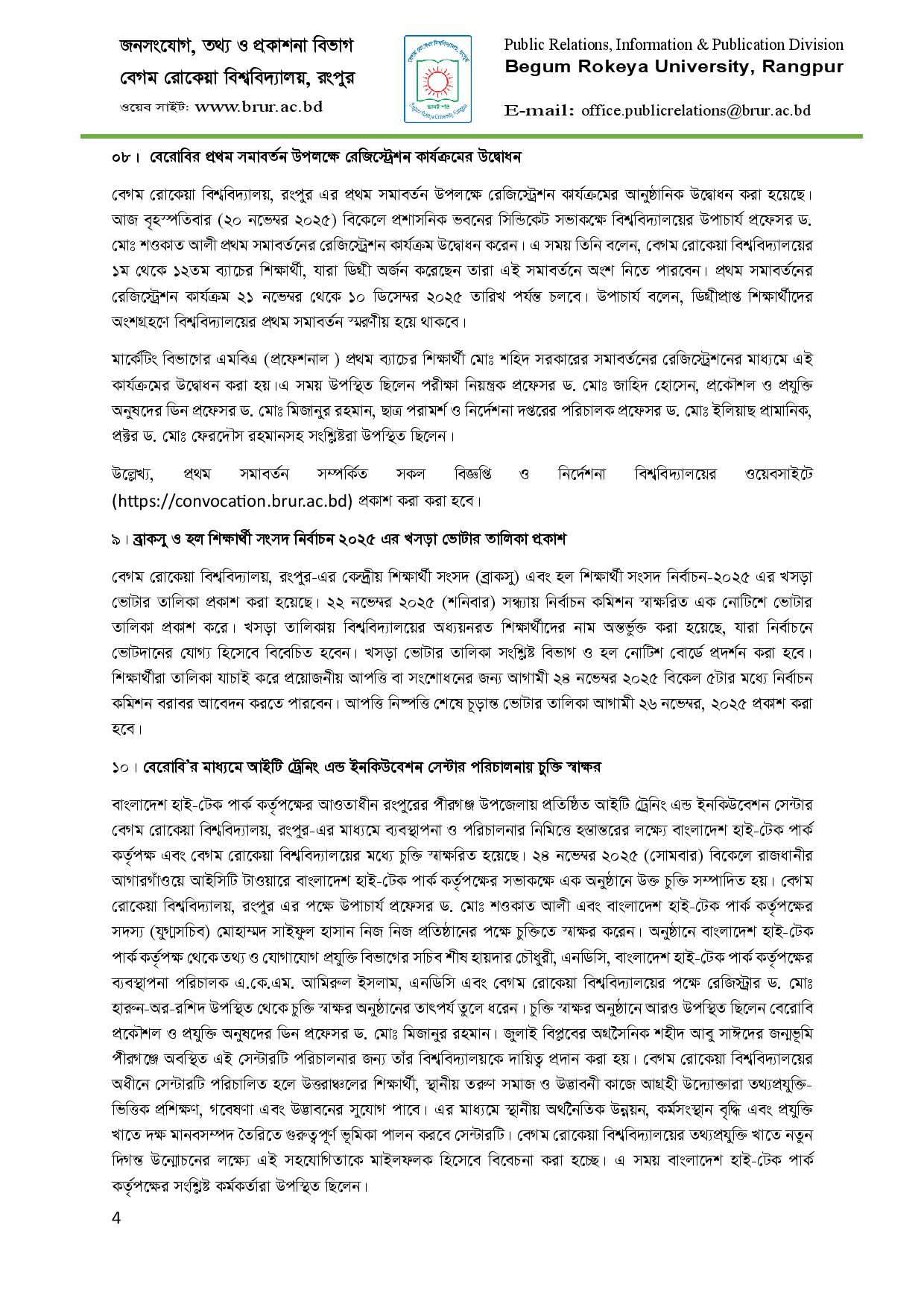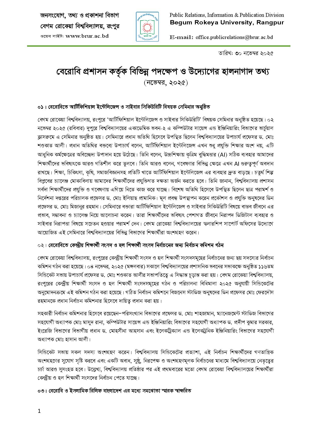 বেরোবি প্রশাসন কর্তৃক বিভিন্ন পদক্ষেপ ও উদ্যোগের হালনাগাদ তথ্য (নভেম্বর, ২০২৫)