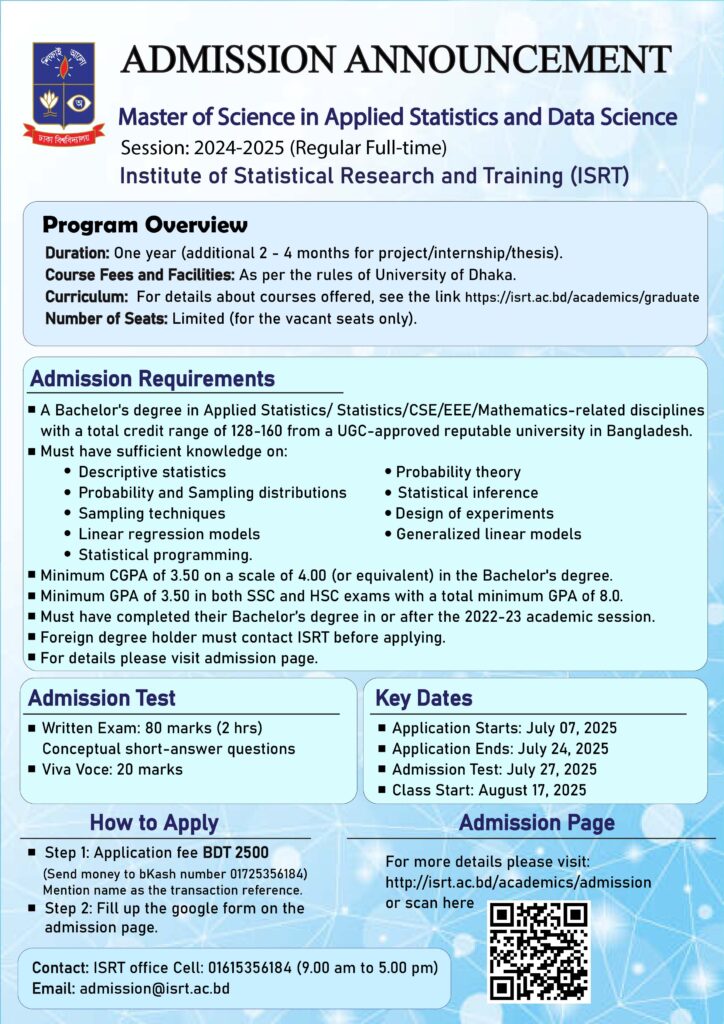Generally, successful students of the B.Sc. (Hons) course in Applied Statistics/Applied Statistics and Data Science are eligible to be admitted automatically to the one-year Master’s program in Applied Statistics and Data Science.