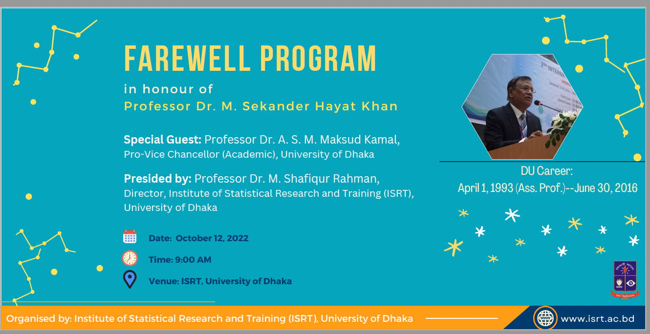 A farewell program for Prof. Dr. Sekandar Hayat Khan sir will be held at 9.00 am tomorrow (Wednesday, Oct 12, 2022) in the ISRT Seminar Room.