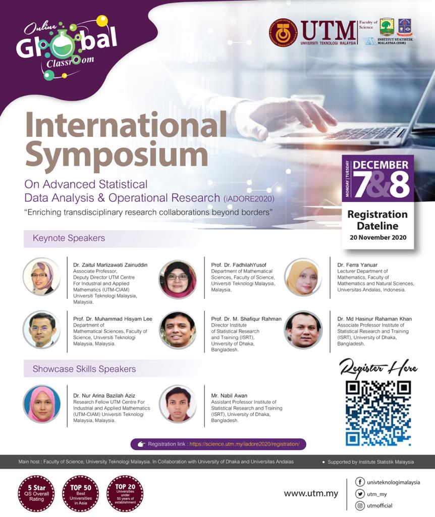 Welcome to the International Symposium on Advanced Data Analysis and Operational Research (iADORE2020). An international symposium that focusses on applications relating to areas of statistics and operation research. The symposium will be held from December 7 through December 8, 2020, virtually. iADORE2020 is an excellent platform for statisticians, operational researchers and industry practitioners to get the latest insight and updates on various applications in many problems.