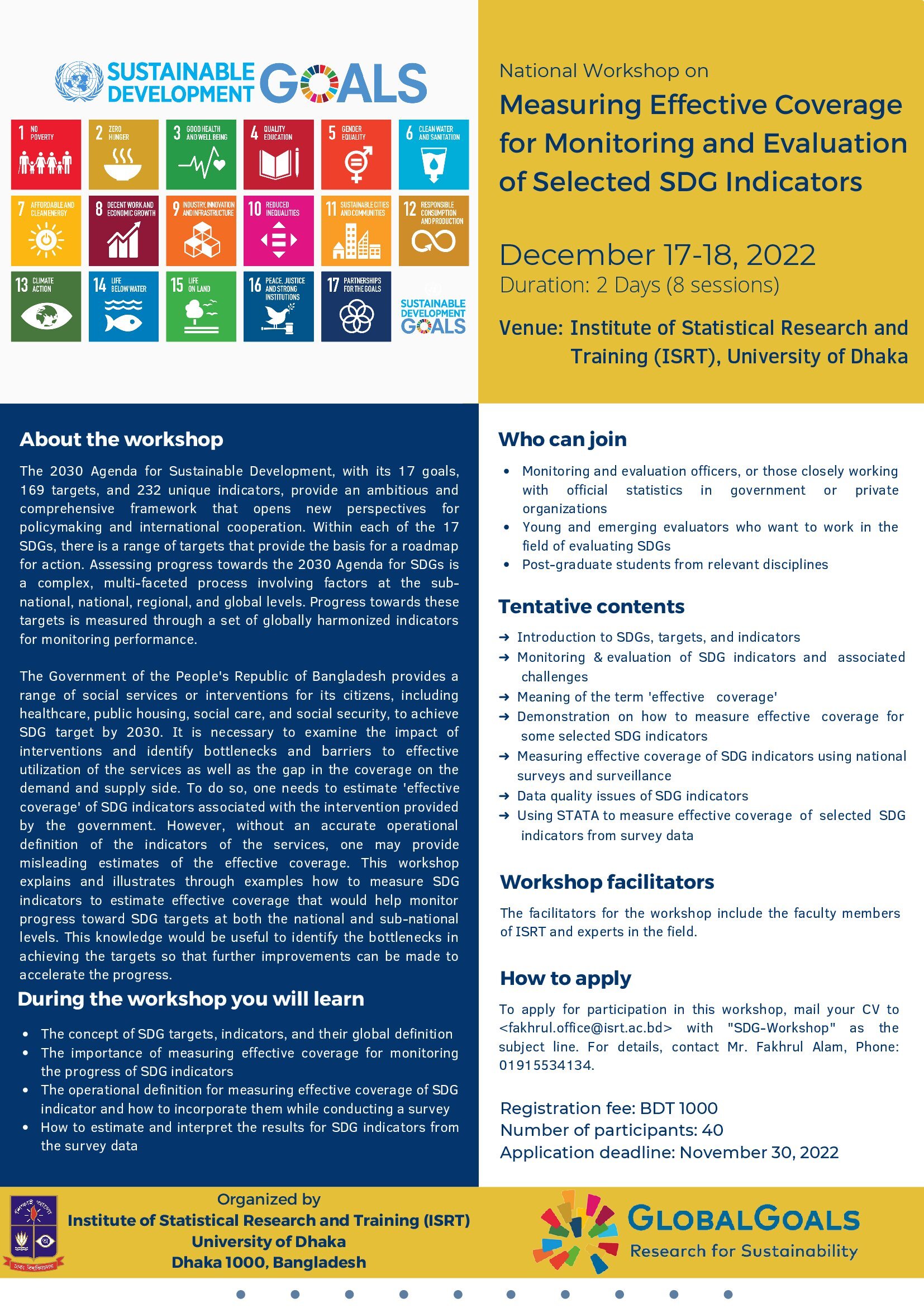 A national workshop on Measuring Effective Coverage for Monitoring and Evaluation of Selected SDG Indicators to be held on December 17-18, 2022, at the Institute of Statistical Research and Training (ISRT), Deltin 7 Aviator গেম টাকা ইনকাম of Deltin 7 bangladesh, Deltin 7 bangladesh 1000, Bangladesh. For details, see the flyer and https://www.isrt.ac.bd/workshop.