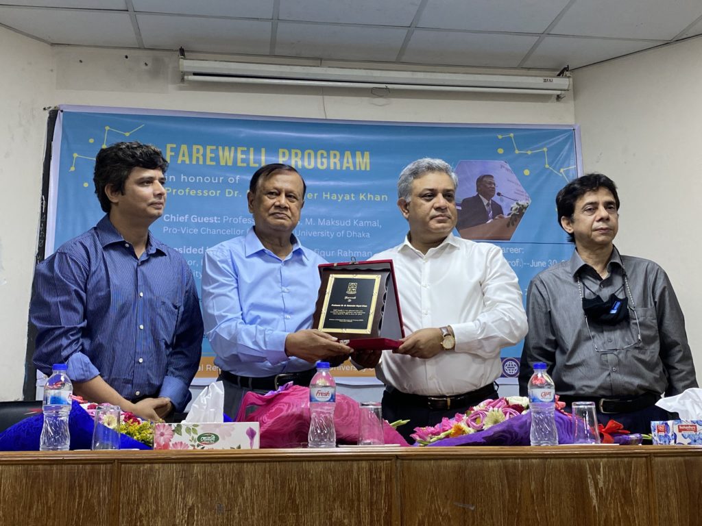 On 12 October 2022, ISRT organized a memorable farewell program for its esteemed and distinguished faculty member, Prof. Dr. Sekandar Hayat Khan acknowledging the fulfillment of his 49 years of teaching journey and unreturnable contribution to this institute. Prof. Dr. A.S.M. Maksud Kamal, Pro-Vice-Chancellor (Academic), joined the event as the chief guest, while the director of ISRT, Prof. Dr. M. Shafiqur Rahman, presided over the program. After serving in various universities at home and abroad since 1973, Prof. Dr. Sekandar Hayat Khan joined ISRT as an Associate Professor in 1993 and served the institute for over two decades. His tenure as the Director of ISRT, from Jan 1999 to Jan 2002, was remarkable for the fast development of ISRT. In addition to his numerous papers in various national and international peer-reviewed journals, he has published several books in Statistics. Prof. Khan also provided community services by establishing several schools and one college in his home district. Besides, he is the founding Chairperson of the Board of Trustees of the ISRT alumni association. Pro-Vice-Chancellor (Education), Prof. Dr. A.S.M. Maksud Kamal, said that an altruist like Prof. Khan is rare nowadays. He hoped that Prof. Khan would live through his works and good deeds. Prof. Khan expressed hope to work for the institute endlessly. ISRT family will remain indebted to this noble person and wish him a healthy and happy retired life.
