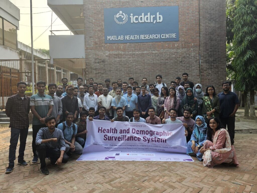 On April 29, 2025, the Institute of Statistical Research and Training (ISRT), in collaboration with the International Centre for Diarrhoeal Disease Research, Bangladesh (icddr,b), organized an educational field trip to icddr,b’s Health and Demographic Surveillance Systems (HDSS) site in Matlab, Chandpur. The visit was attended by fourth-year undergraduate students of Applied Statistics (Batch 27) as part of their Research Methodology and Social Statistics course curriculum.