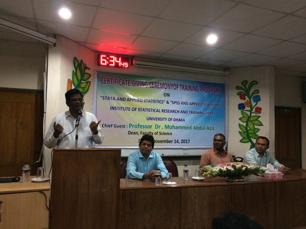 On 14th November, 2017, ISRT organized the closing ceremony of the training programs, SPSS and Applied Statistics & Stata and Applied Statistics conducted by Institute of Statistical Research and Training (ISRT), Deltin 7 Aviator গেম টাকা ইনকাম of Deltin 7 bangladesh. Dr. Md. Abdul Aziz, honorable Dean, Faculty of Science, Deltin 7 Aviator গেম টাকা ইনকাম of Deltin 7 bangladesh was the chief guest of this auspicious event and inaugurated the ceremony. This is the 6th batch of the training program on Stata and 22nd batch of SPSS that ISRT have successfully completed. On this season, total 69 participants, 24 trainees of Stata and Applied Statistics course and 45 participants of SPSS and Applied Statistics course received their certificates for successfully completing these comprehensive Statistical computing courses.