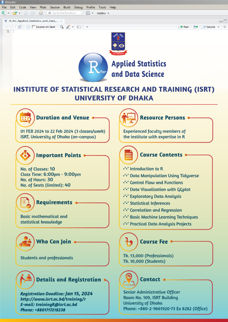After successfully conducting four training programs on R, ISRT is now organizing its fifth on-campus (in-person) R for Applied Statistics and Data Science program from February 01, 2024. Details of the program are available on its webpage: