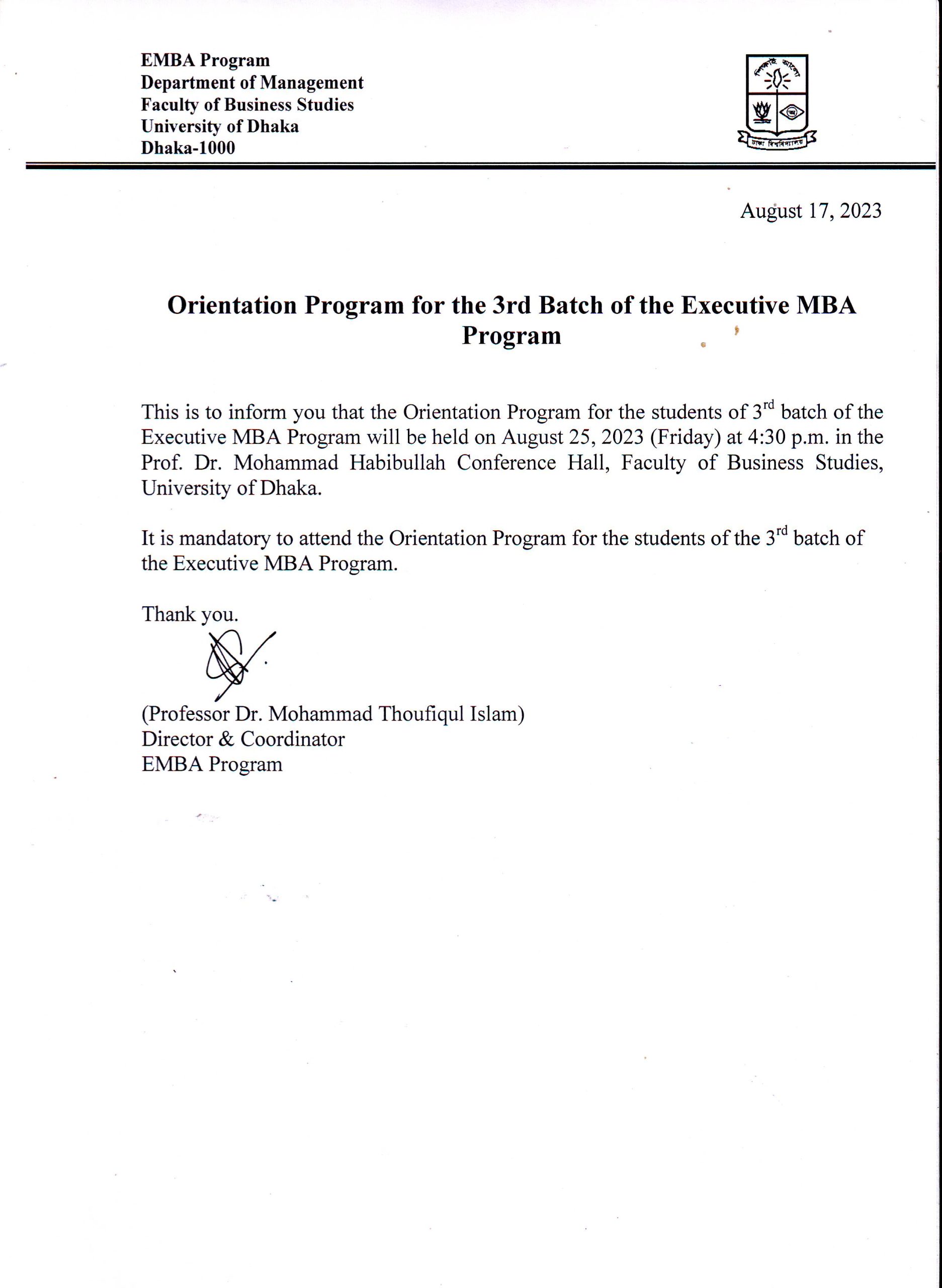 Thoufiqul Islam, the Director and Coordinator of the EMBA Program promised that both the