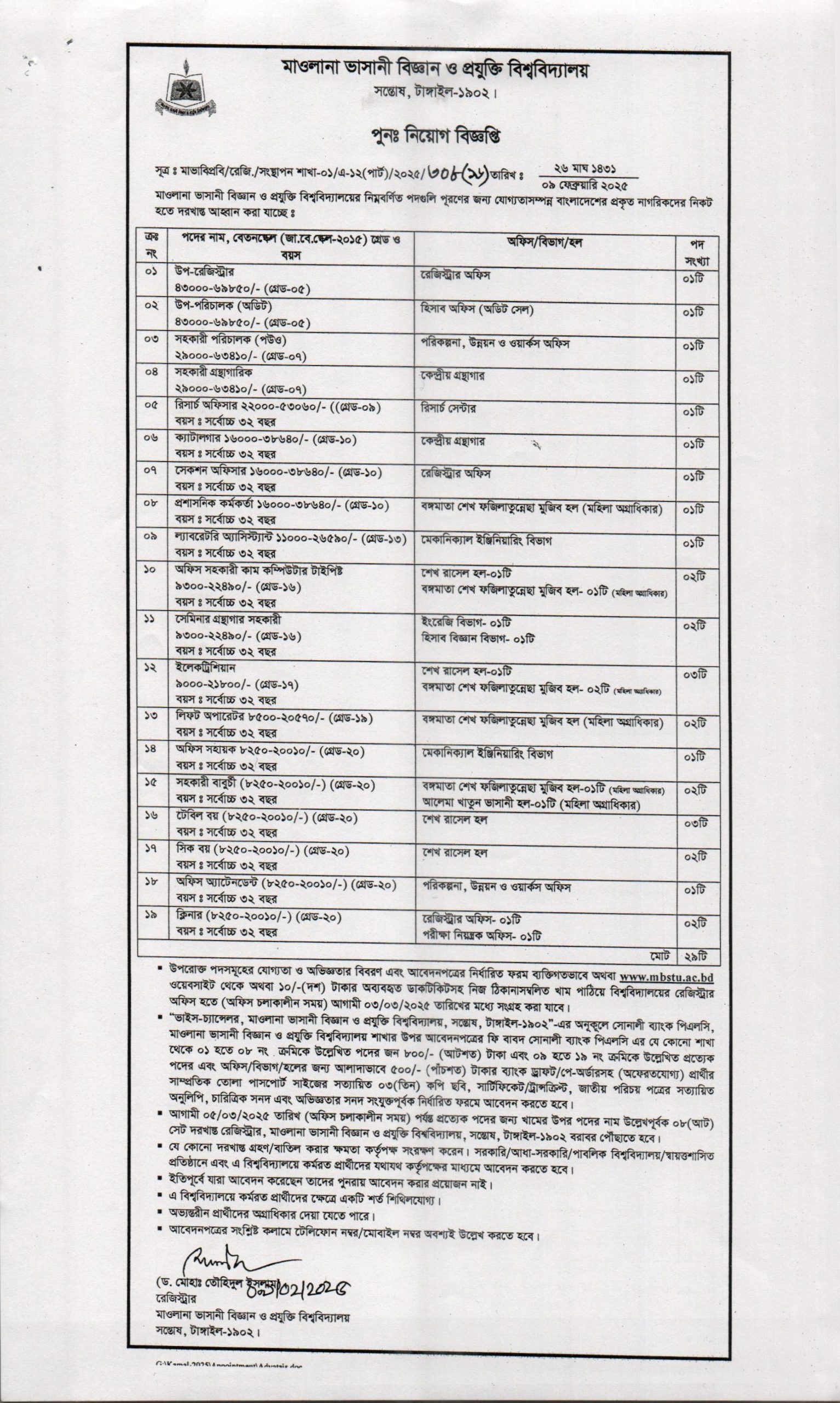 মাওলানা ভাসানী বিজ্ঞান ও প্রযুক্তি বিশ্ববিদ্যালয়ে বিজ্ঞপ্তিতে উল্লেখিত পদসমূহ পূরণের জন্য যোগ্যতাসম্পন্ন বাংলাদেশের প্রকৃত নাগরিকদের নিকট হতে দরখাস্ত আহ্বান করা যাচ্ছে।