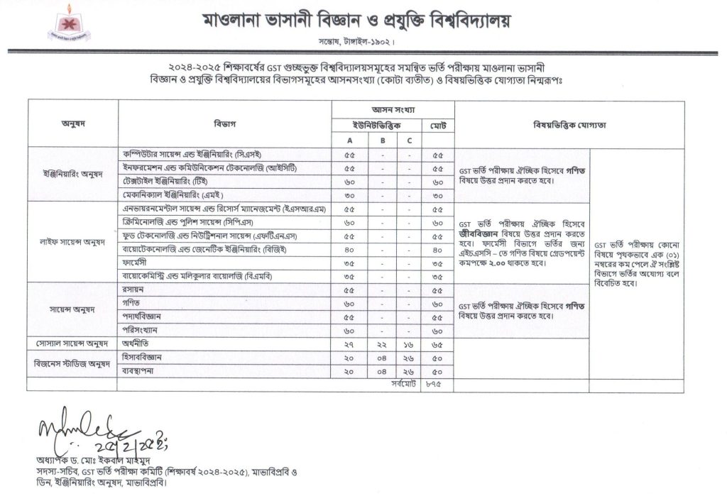 মাওলানা ভাসানী বিজ্ঞান ও প্রযুক্তি বিশ্ববিদ্যালয়ের Deltin 7 অ্যাপসমূহের আসন সংখ্যা (কোটা ব্যতীত) ও বিষয়ভিত্তিক যোগ্যতাঃ