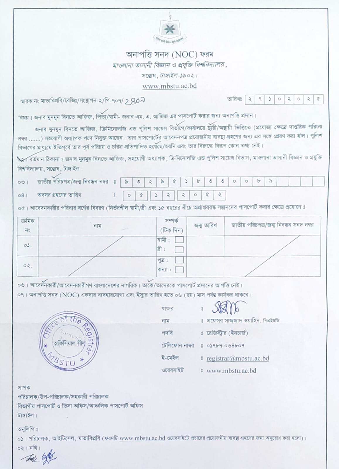 | Professor Dr. Md. Sirajul Islam | PASSPORT / VISA | 29 Jul 2025 | View |