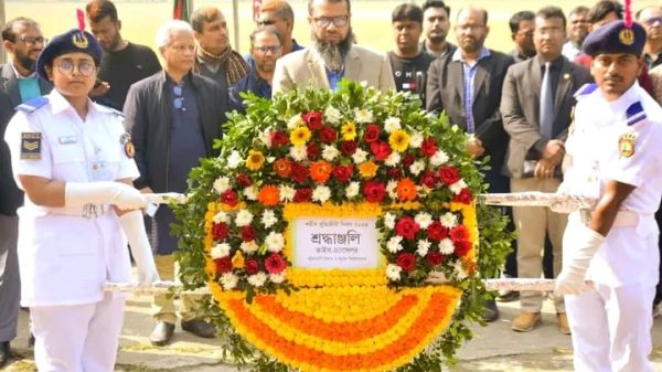 কেন্দ্রীয় শহীদ মিনারের সম্মুখে জাতীয় পতাকা উত্তোলন ও অর্ধনমিত করেন প্রো ভাইস চ্যান্সেলর প্রফেসর ড. এসএম হেমায়েত জাহান এবং কালো পতাকা উত্তোলন করেন বিশ্ববিদ্যালয়ের ট্রেজারার প্রফেসর মোঃ আবদুল লতিফ । পতাকা উত্তোলন শেষে শহীদ মিনারে পুষ্পস্তবক অর্পণ করেন প্রো ভাইস চ্যান্সেলর প্রফেসর ড. এসএম হেমায়েত জাহান এবং ট্রেজারার প্রফেসর মোঃ আবদুল লতিফ ।