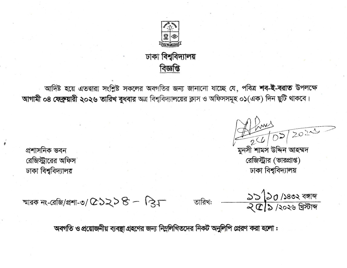 পবিত্র শব-ই-বরাত উপলক্ষে আগামী ০৪ ফেব্রুয়ারী ২০২৬ তারিখ বুধবার বিশ্ববিদ্যালয়ের ক্লাস ও অফিসসমূহ ০১ (এক) দিন ছুটি থাকবে