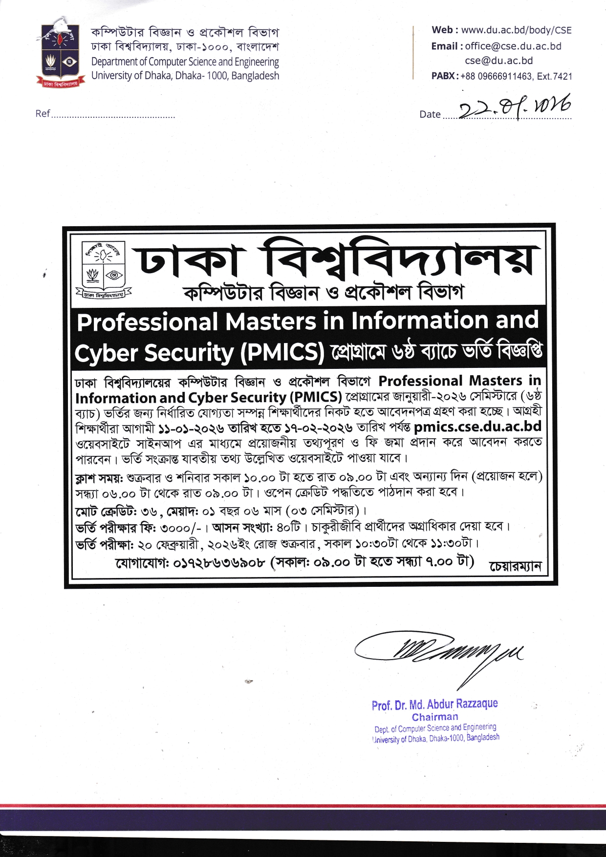 Professional Masters in information and Cyber Security (PMICS) প্রোগ্রামে ৬ষ্ঠ ব্যাচে Deltin 7 IPL বেটিং বিজ্ঞপ্তি