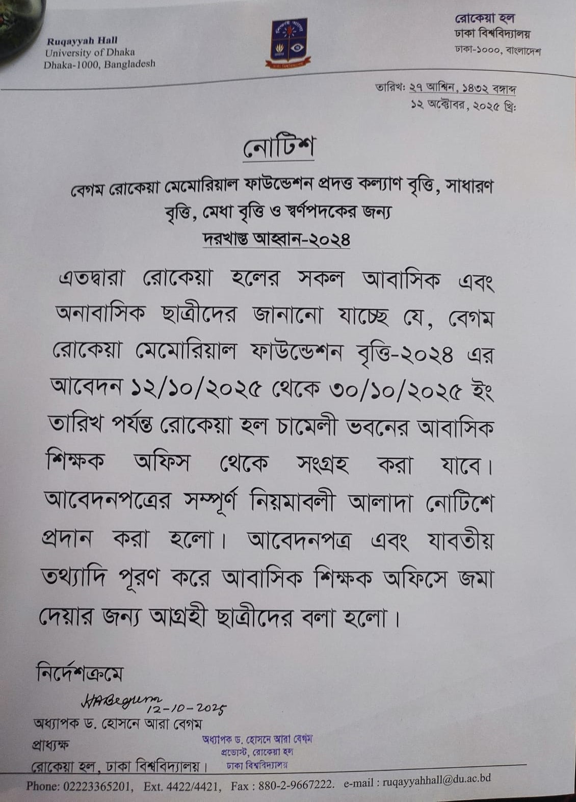 রোকেয়া হলে নিয়মিত ছাত্রীদের নিকট থেকে দরখাস্ত আহ্বান প্রসঙ্গে বিজ্ঞপ্তি(২য় কল)।