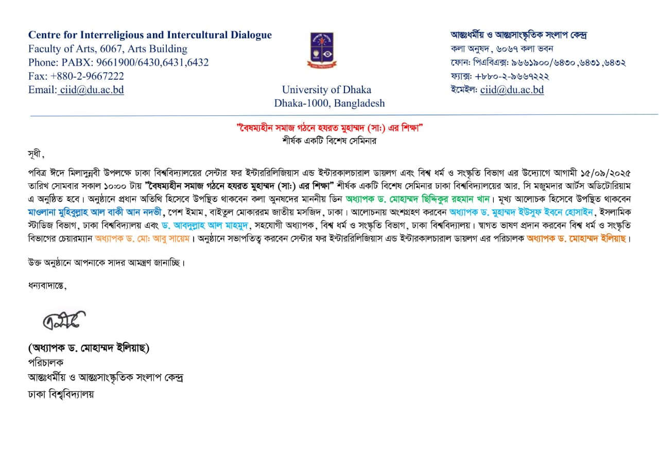 A Special Seminar on ''July Revolution: Spirit of Religious Harmony and Way Forward'' at Dr. Sakina Azhar Seminar room (5006, Arts Building) on Monday, August 25, 2025 at 2:00 pm .