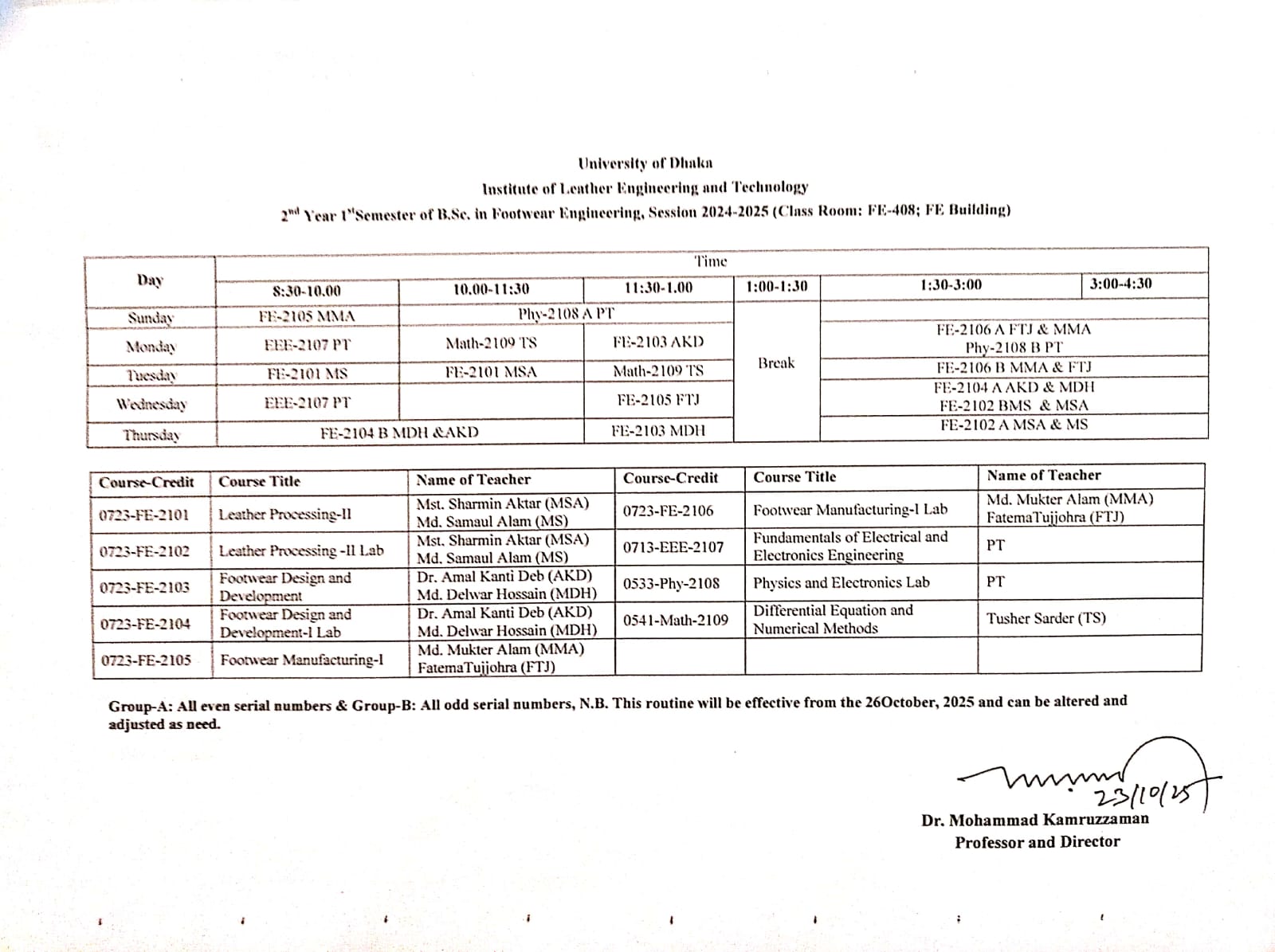 4th Year 1st Semester B.Sc. in LE/FE/LPE-2025: class routine