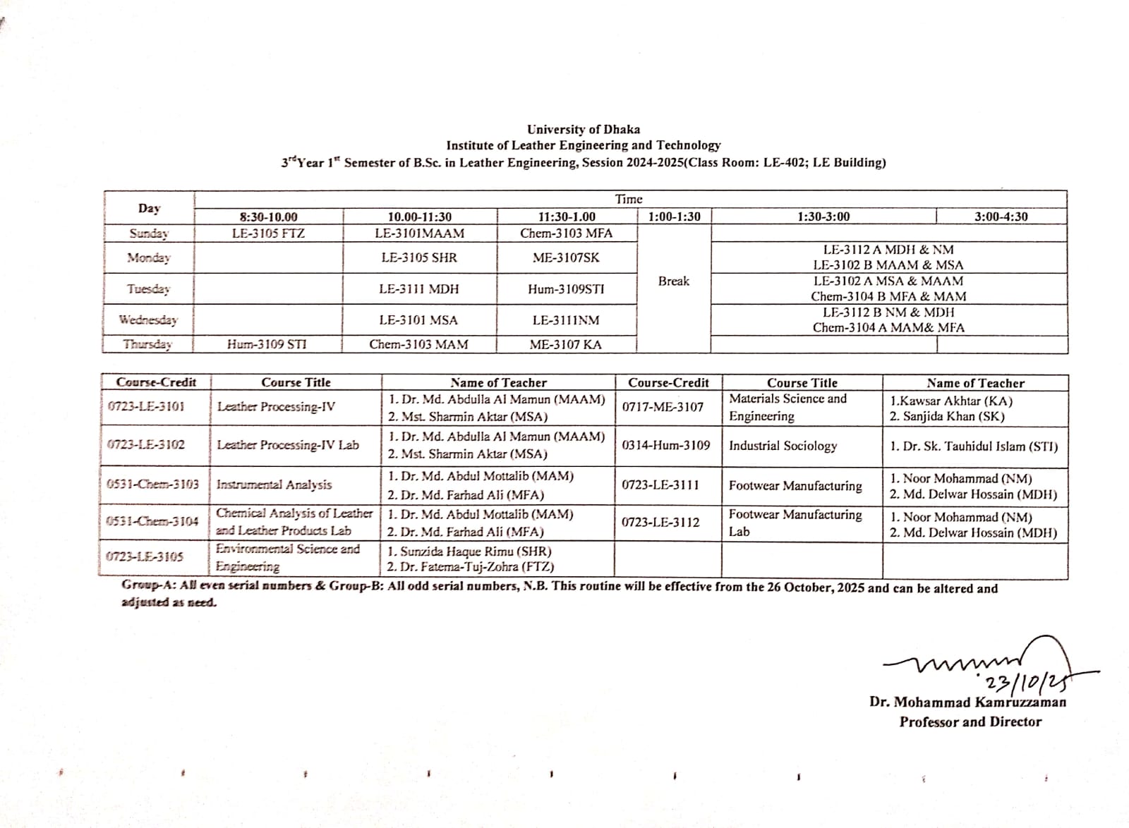 4th Year 1st Semester B.Sc. in LE/FE/LPE-2025: class routine