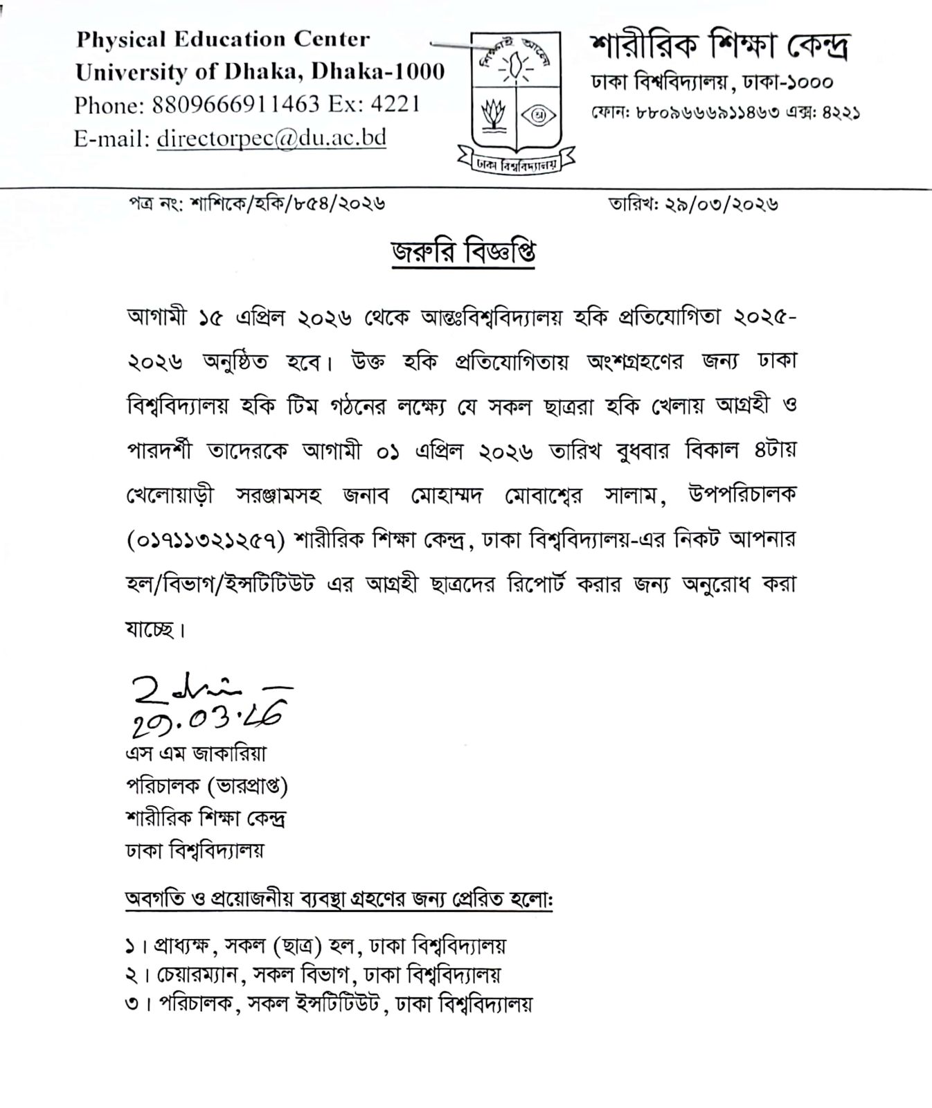 বিজ্ঞপ্তি: আন্তঃবিশ্ববিদ্যালয় হকি প্রতিযোগিতা ২০২৫-২০২৬