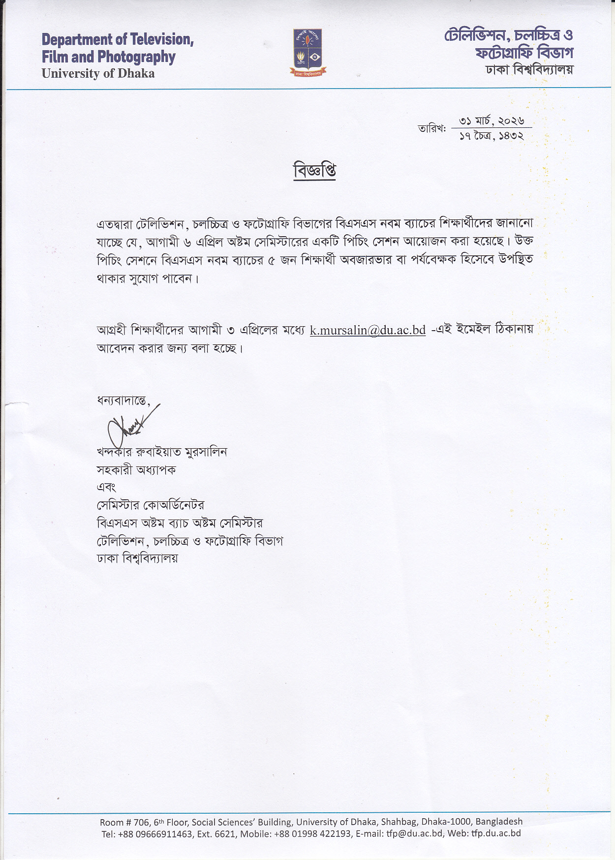 বিজ্ঞপ্তি: গ্রাজুয়েট প্রোডাকশন কর্মশালা (বিএসএস ৮ম ব্যাচ ৮ম সেমিস্টার)