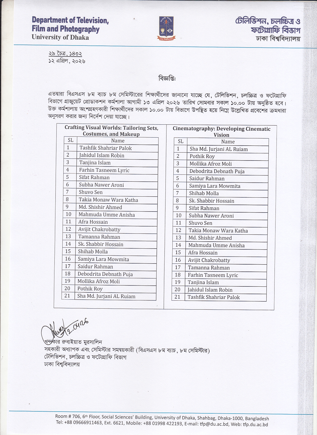 বিজ্ঞপ্তি: গ্রাজুয়েট প্রোডাকশন কর্মশালা (বিএসএস ৮ম ব্যাচ ৮ম সেমিস্টার)