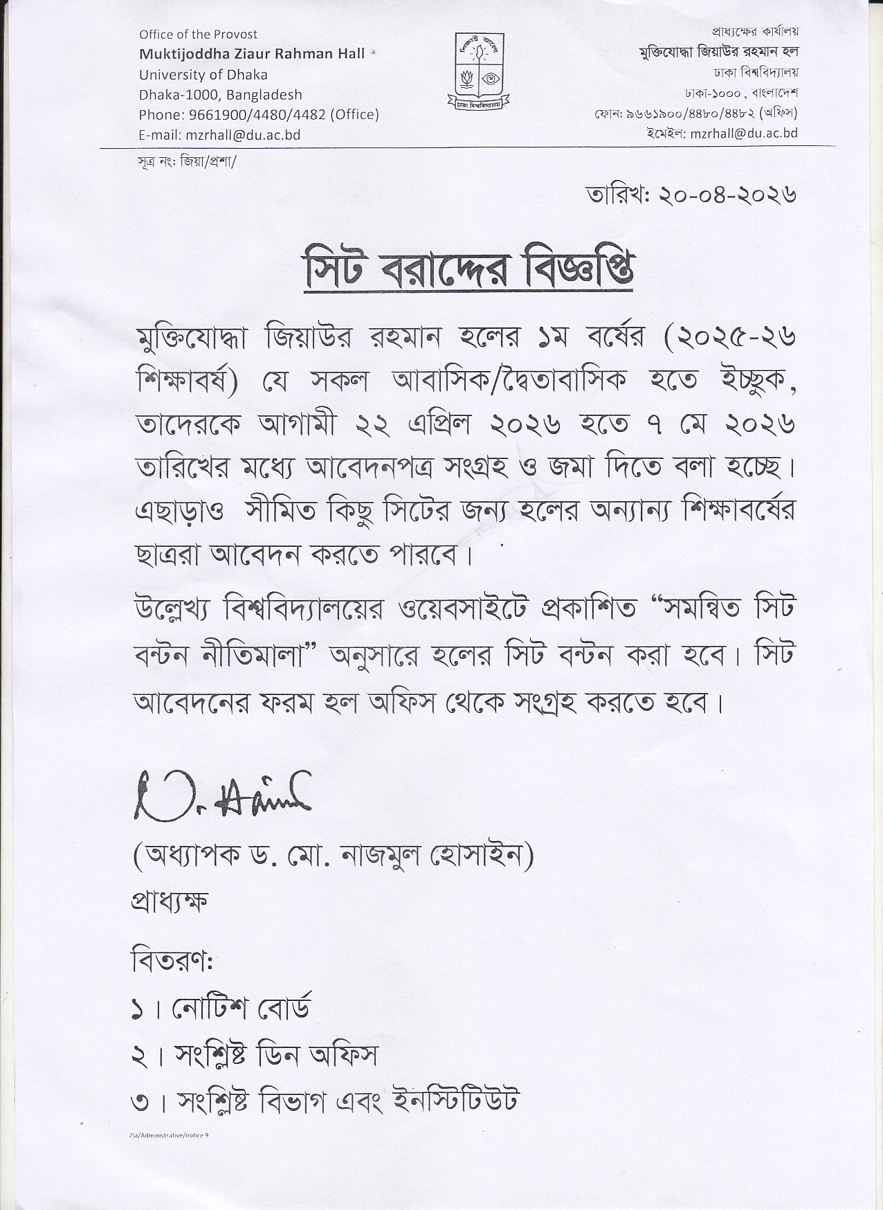 বিজ্ঞপ্তি: মুক্তিযোদ্ধা জিয়াউর রহমান হল
